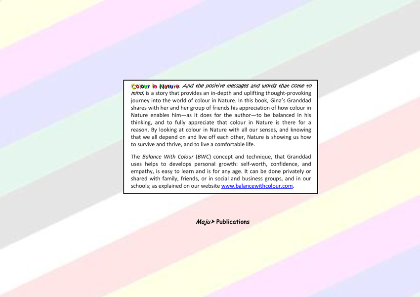 journey into the world of Colour in Nature. In this book Gina’s Granddad shares with her, and her friends, how colour in Nature enables him—as it is