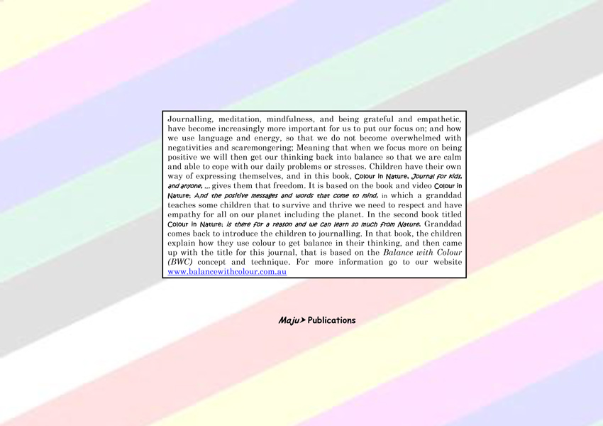 This journal was designed for children but can be used by anyone… It is based on the video and colouring book, Colour in Nature: And the positive messages and words that come to mind. Where Granddad explains the Balance With Colour concept to Jason, Alice, Tom, Benny, Nic and Gina.